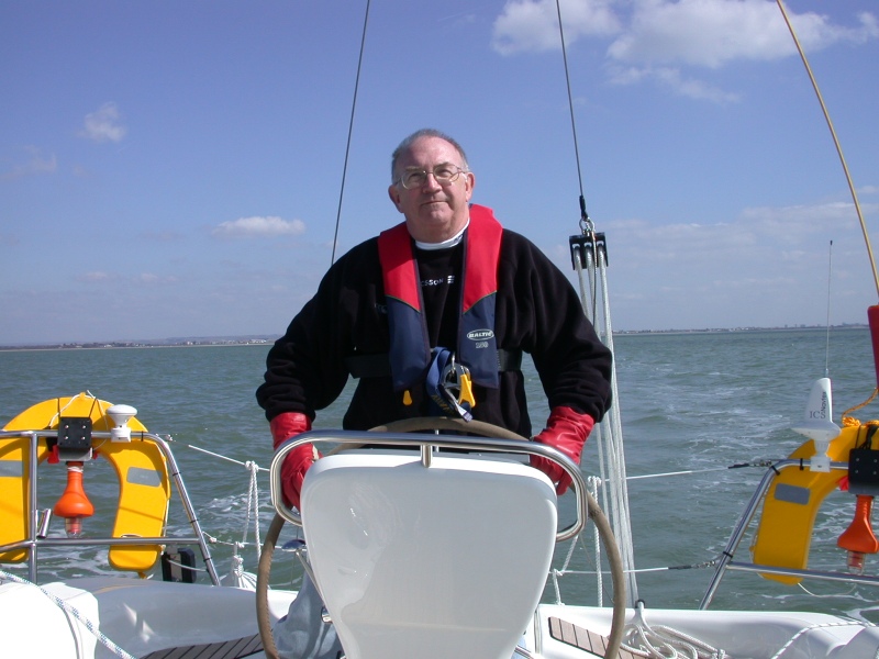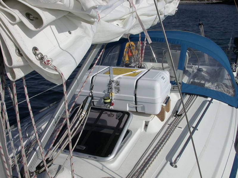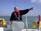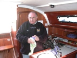 Poor weather meant that the handover delivery trip had to be delay until the following day. The trip, with some photographs, is detailed on the Handover page in the Cruises section. This first, short, sea trial convinced us we had made the right choices; we are delighted with Bagadeus. She is roomy, comfortable, sails well, has ample engine power and is extremely well equipped. She is every bit the boat we hoped she would be. March 2002: Transfer to Camper & Nicholson's Marina, GosportAfter her final fitting out and charter coding work, we took Bagadeus from Port Hamble Marina to Camper & Nicholson's Marina at Gosport, her first operational base, on a pleasant spring day on 26th March 2002. Because of the good weather, and because we had Alan, a friend, along for the trip, we tried her handling under various sail configurations, practiced some MOB manoeuvres off Lee-on-Solent and put into the Medina River for lunch before the eight-mile beat to the Swashway and C&N. Above, you can see a few photographs of Alan undergoing training in helming and basic galley skills. April 2002: Out on CharterIn April 2002 Bagadeus started her work as a charter boat. Amongst the charters, the owners used Bagadeus for three cruises during 2002; details are on the 'Cruises' page. August 2002: Canister Life Raft fitted