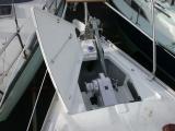 In August 2002 we arranged for the liferaft to be repacked into a canister and mounted on deck, ahead of the sprayhood, on a teak mounting frame. The new arrangement can be seen on the right. The liferaft is attached with quick-release shock cord and tether line fitted with a cutter on a hydrostatic fuse. Launching the liferaft is now just a matter of releasing the shock-cord mountings and throwing the canister overboard. The liferaft will then inflate, attached by the tether line. When abandoning to the liferaft, crew board the raft and cut the tether with a knife (the raft carries a suitable knife). If the boat sinks with the liferaft still in place, at a certain depth the hydrostatic fuse fires and cuts the tether so that the liferaft automatically rises to the surface and inflates. January 2003: Pacamain Mainsail Stowage System installedThroughout her first season, Bagadeus had been fitted with lazyjacks to aid in lowering the mainsail, but we were not completely satisfied with the simple system we had. In January 2003 we had a Pacamain system fitted. This consists of a canvas bag carried along the boom into which the mainsail is dropped; lazyjacks are fitted running from the top edges of the pacamain bag to a point well up on the mast. The pacamain bag can be zipped up to pack the main away simply and quickly. In use, to drop the main one has simply to lower the mainsail halyard; the mainsail will then fall, guided within the lazyjack lines, into the pacamain bag. The bag is then zipped up and that is that - the mainsail is secured and stowed.