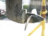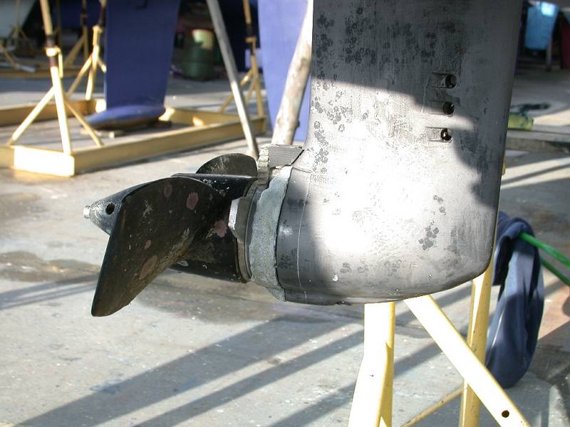 February 2003: Winter Lift, Scrub and AntifoulBagadeus was lifted for an annual underwater scrub and antifoul on Thursday 6 February 2003. We visited her to have look at her undersides on Monday 10 February 2003. When we saw her she had had an intial scrub before final clean, paint and antifoul. The anode around the propeller shaft had done its job, as can be seen in the photographs below. The anode was renewed shortly after the photograph was taken, the propeller and saildrive painted and antifoul applied. She went back into the water on Thursday 13 February 2003.