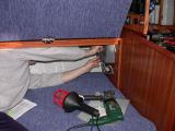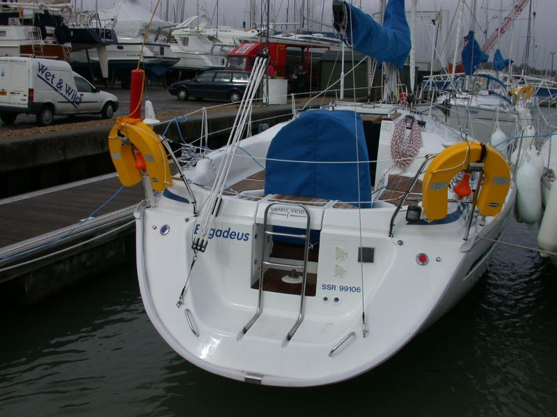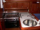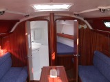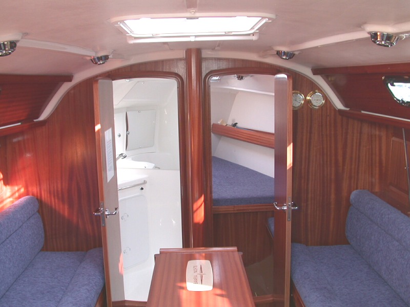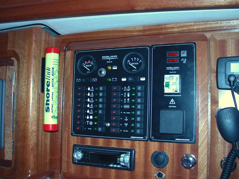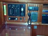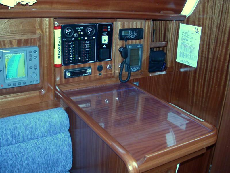 Interior detailsSome of the main features of the saloon including navigation area, galley and heads/shower compartment.Click on any of the photographs to see a larger image:The three photographs below show bagadeus' Navigation Area. The Chartplotter, on the left of the general view, hinges out and locks in position so that it faces and is easily to hand for the navigator in his normal seated position. The tube mounted between chartplotter and switch panel is the emergency VHF antenna. The main switch panel is above the chart table, with below it the broadcast radio and CD player, a mains outlet when shore power is connected, and a 12V outlet socket for mobile telephone chargers and the like. The small DIN socket below the 12V socket is a NMEA interface to allow a laptop PC to be connected so that e.g. waypoints and routes can be transferred to or from the PC. Of course, anything controllable via the NMEA bus could, with appropriate PC software, be controlled from the laptop if required. To the right of the switch panel are the Marine VHF DSC Radio (Simrad RD68) and the ICS Nav6 Plus NAVTEX receiver for weather and navigation warnings; NAVTEX broadcasts are stored and displayed under operator control on the unit's LCD screen. The small panel below the NAVTEX receiver, at table height, is the status panel for the 40A battery charger system.