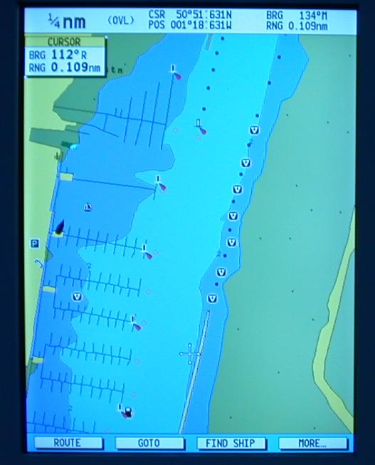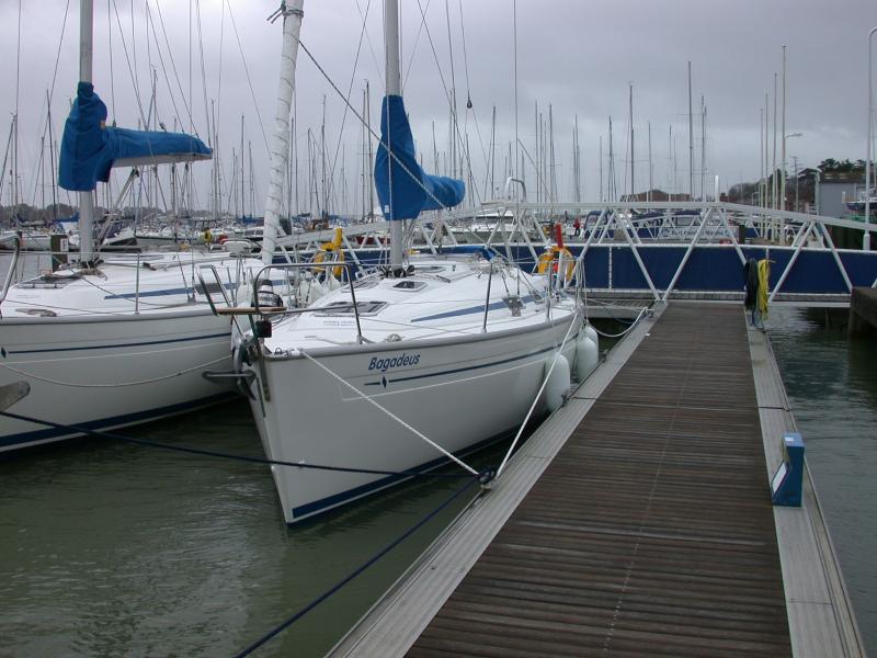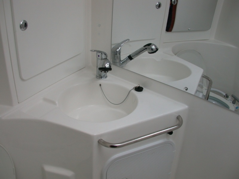 The photograph on the left below shows a detail from the chartplotter screen. The chartplotter was switched on just to take these photographs; since the unit automatically selects the most detailed chart available, it had selected the detailed chart of Port Hamble Marina. The small black boat symbol at centre left indicates bagadeus' position. The accuracy of the GPS system can be judged by comparing the chart screen with the external photographs on the right showing bagadeus' location at the time. You can see that the chartplotter is indicating her position correctly to within a metre or two. On the left below is a general view of the saloon, looking forward. The two instruments on the starboard side of the saloon are a clock and an aneroid barometer. The port-side door leads to the heads compartment, the starboard-side door to the forward cabin. The heads compartment is surprisingly roomy; the depth is matched by the depth of the standing/dressing area in the forward cabin, with the bunks extending the full width of the boat. The standing/dressing area also contains a small seat and, behind the seat, storage and hanging lockers. The galley area is shown in the centre, with the sink and electric refrigerator. There is a mains outlet socket above the refrigerator, mains power is available when shore power is connected. A view of the heads compartment, taken from the doorway, on the right. The marine toilet can just be seen in the mirror. The tap nozzle pulls out on an extension to provide a hot-water shower. Shower water pump out is by electric pump controlled by the small black switch to the right and below the grab handle on the washbasin stand. |