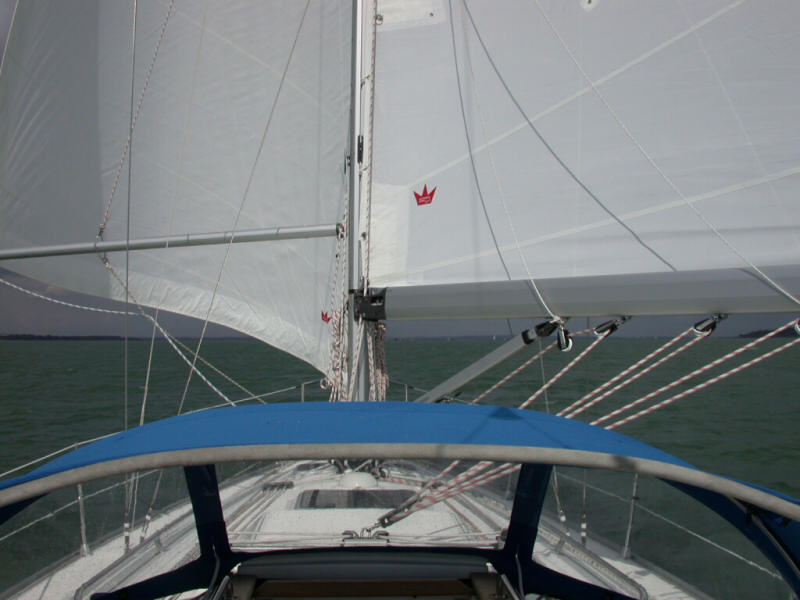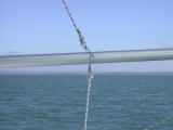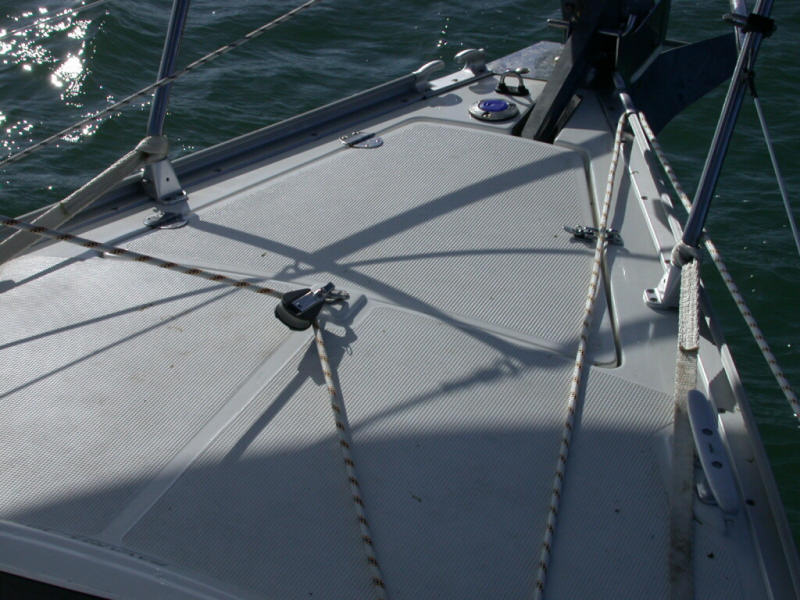 the bows showing the preventer line running through the starboard cleat and the